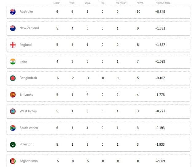 World Cup Points Table 2019 Updated Icc Cricket World Cup Team Standings After Afghanistan Vs New Zealand - Check afghanistan vs bangladesh, icc cricket world cup 2019 2019, 31st match match scoreboard, ball by ball commentary, updates only on espn.com.
