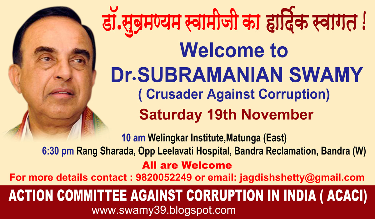 Dr Subramanian Swamy Dr Swamy Visiting Mumbai On 19th November To Address Two Public Meetings - Member, i give as good as i get www.vhsindia.org.
