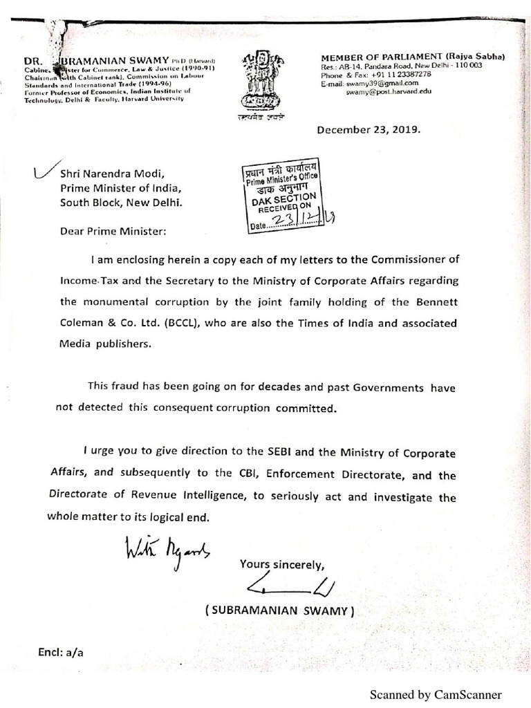 Subramanian Swamy S Complaint To Pm Others On Frauds Of Times Of India Group Dec 23 2019 - Correspondence of dr.subramanian swamy with dr.a.p.j.abdul kalam.