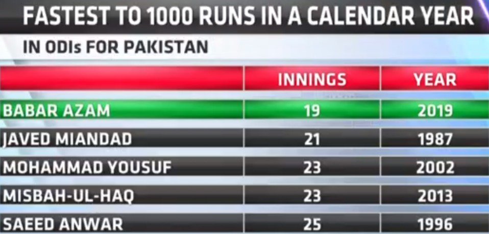 Azam Eclipses Miandad S Record To Become Fastest Pakistan Batsman To Score 1000 Odi Runs In Calender Year - Listing is based on number of innings taken by batsman to get 1000s runs.