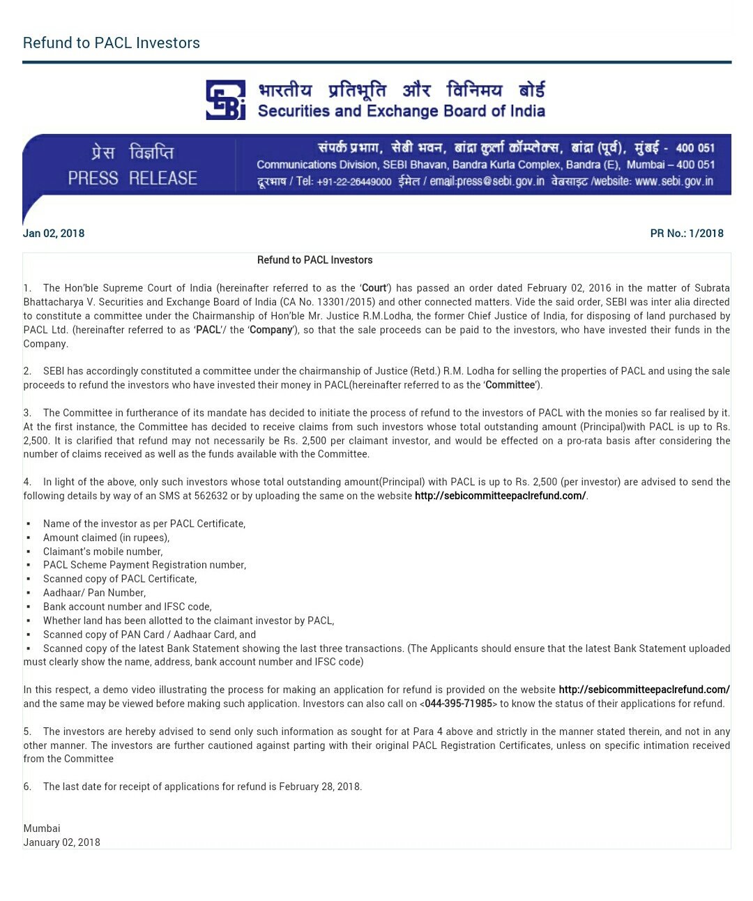 Sebi Pacl Refund Status News 2020 Readerism Com - And using the sale proceeds to refund investors who have invested moniesin pacl ltd.the committee is taking all requsitesteps to perform its mandate under the overall supervision of hon'ble supreme courtand has filed reports.